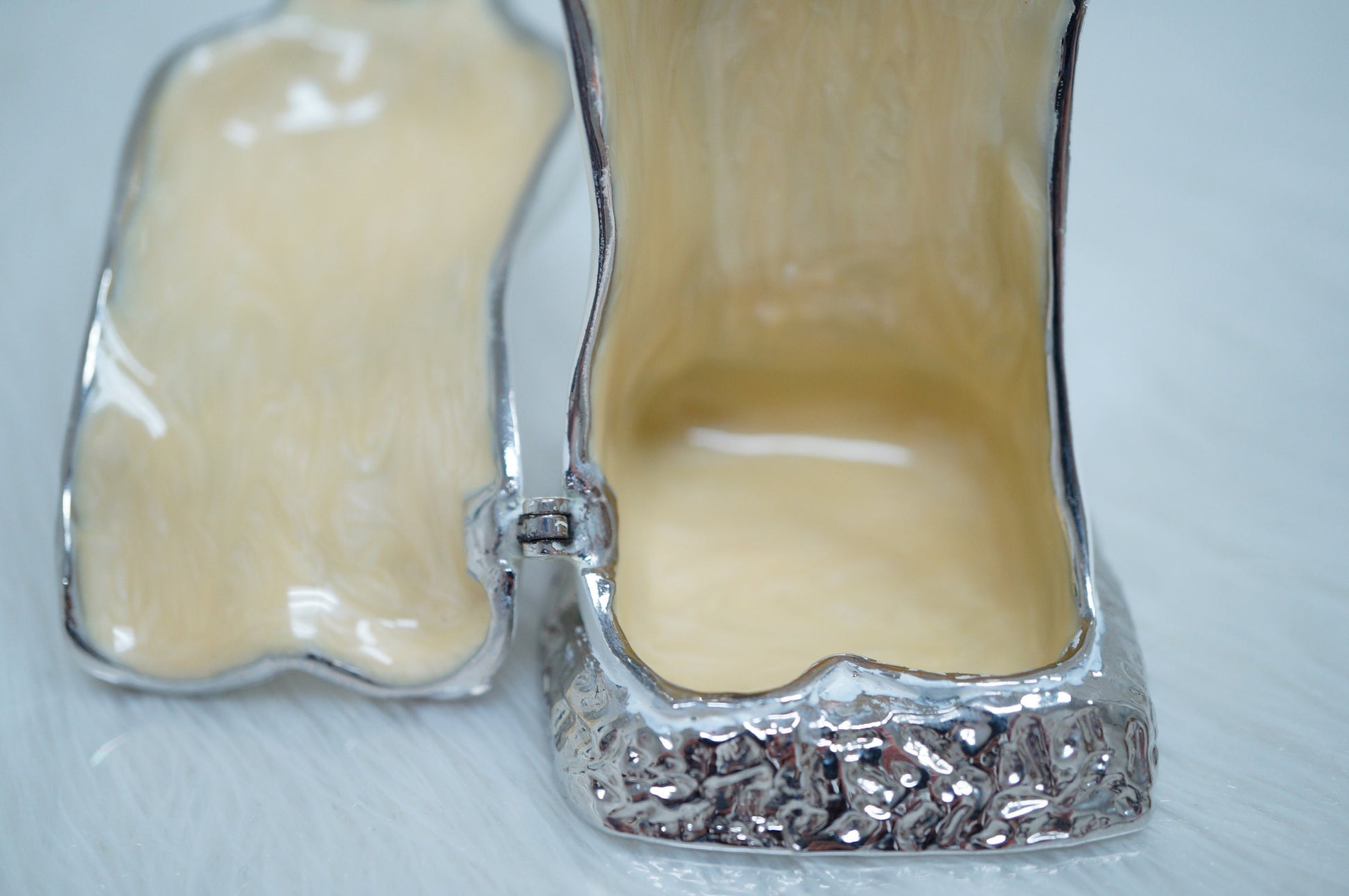 Opens on a hinge and has a magnetic closure to keep box shut securely.