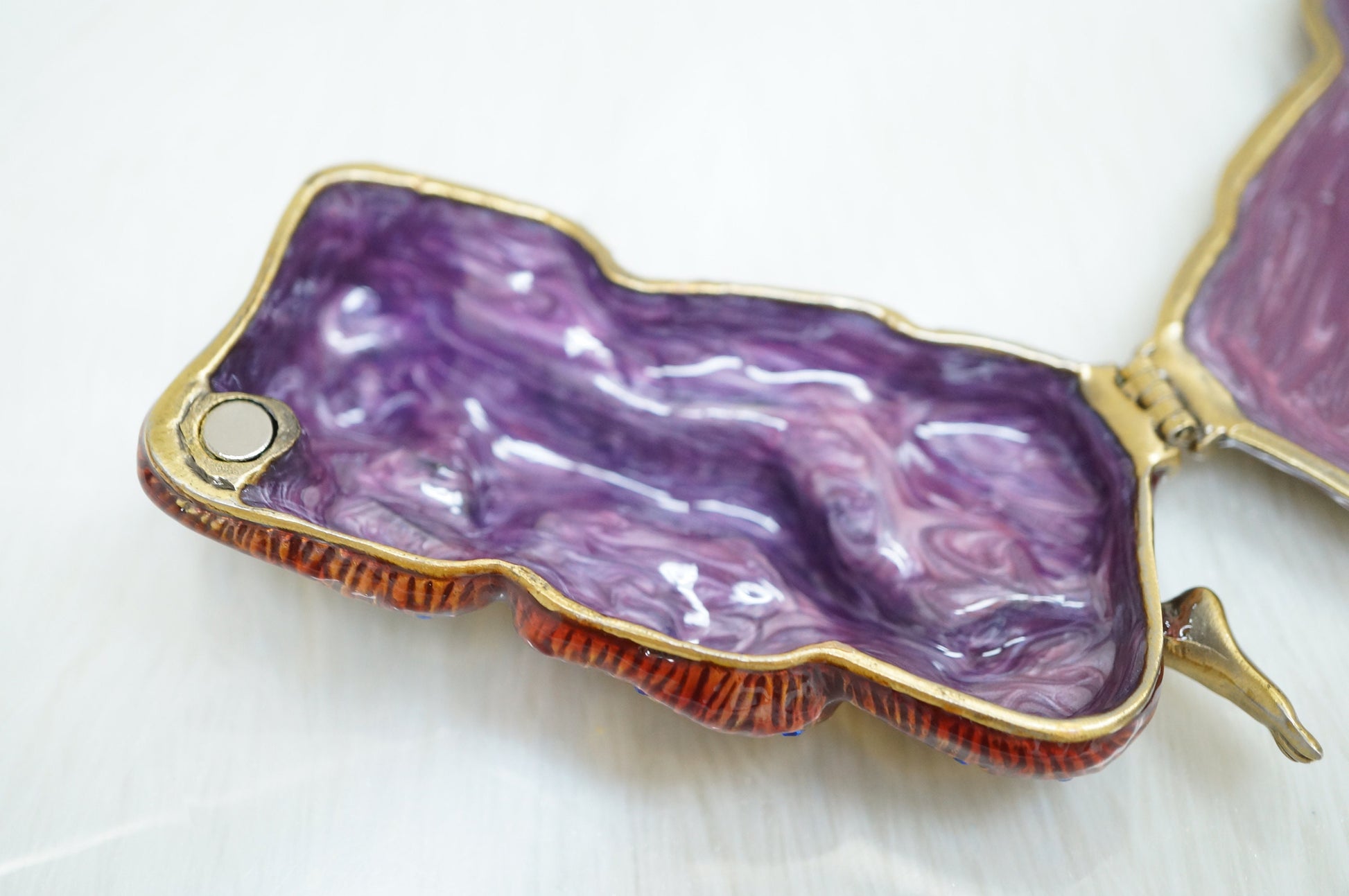 Opens on a hinge and has a magnetic closure to keep box shut securely.