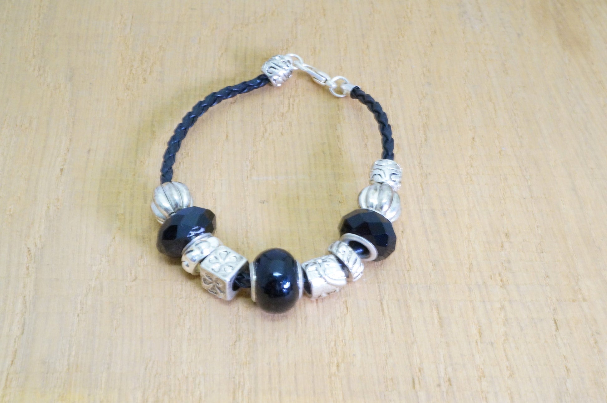 Faux Beaded Multi Silver Toned Charms Faux Braided Leather Bracelet Fashion Jewelry