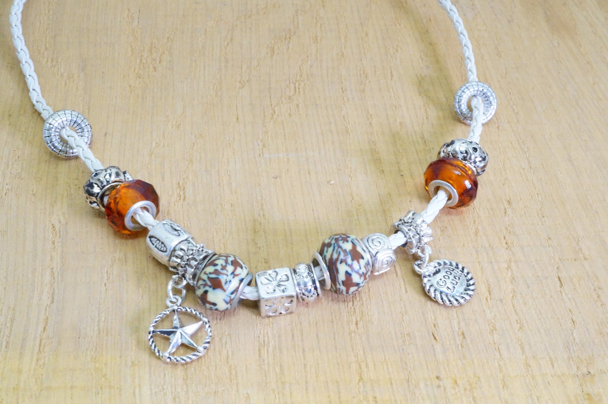A necklace made of metal charms, faux rhinestone on a braided faux leather chord.