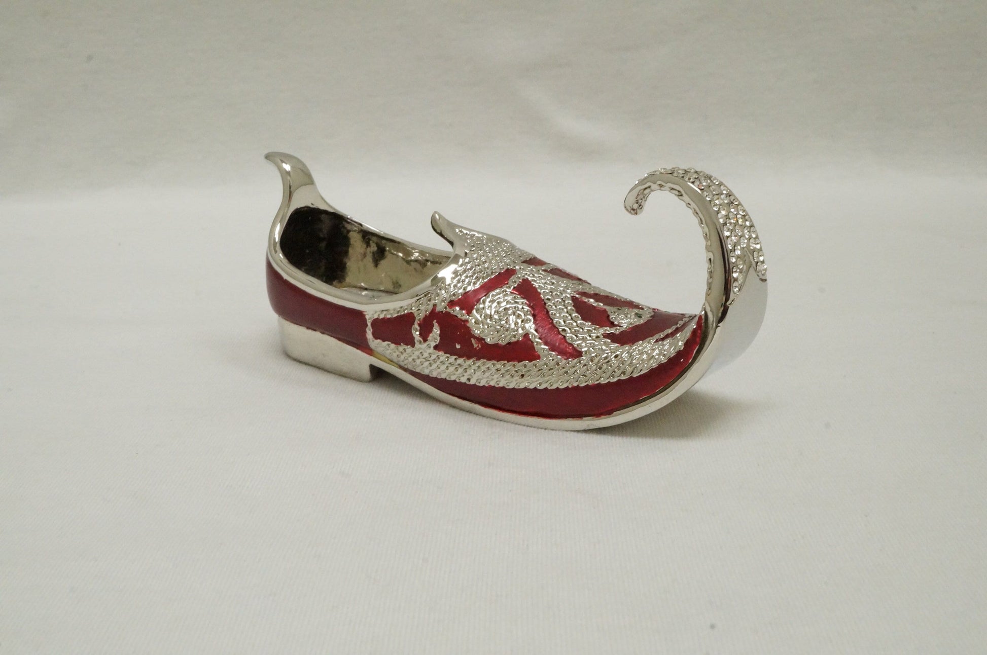 India Jutti Curled Toe Loafer Miniature Figurine can be used as a desk decoration, paperweight or ornament. It is made of pewter and jeweled with Austrian Crystals.