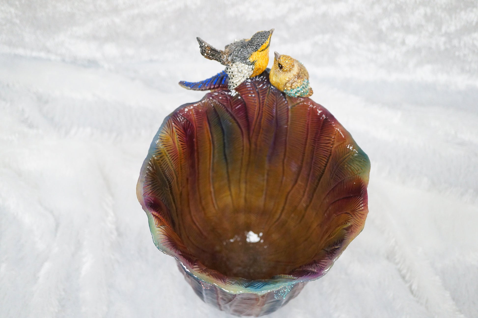 The vase symbolizes a blossoming flower when it's still in blooming stage. The two birds on the top are nourishing the flower with love and care. The colors chosen for the flower are duller and splashed with bright colored crystals as a transformation from the nourishment of the birds. The colors chosen for the birds are shinny and vibrant to exude the positive aura.