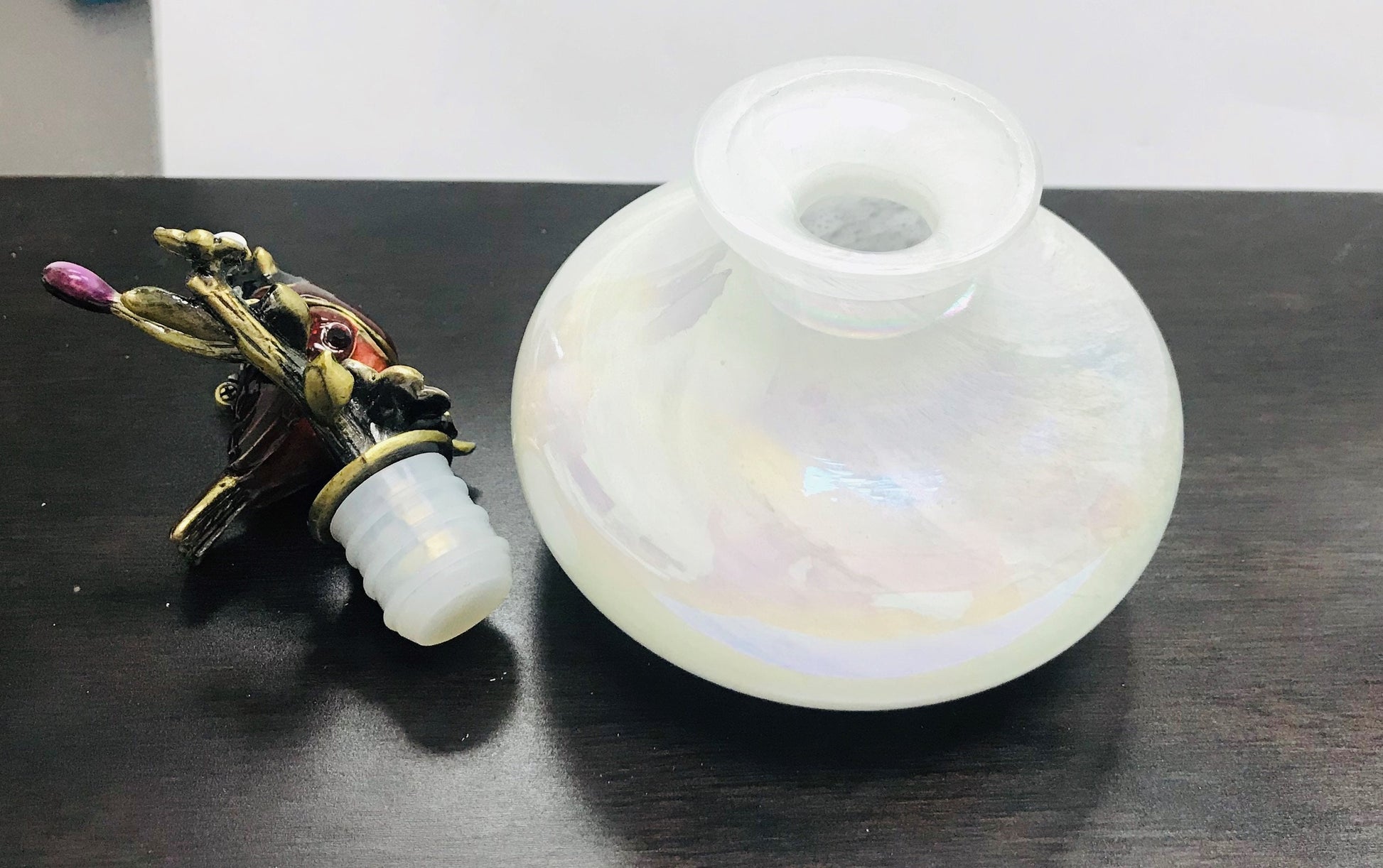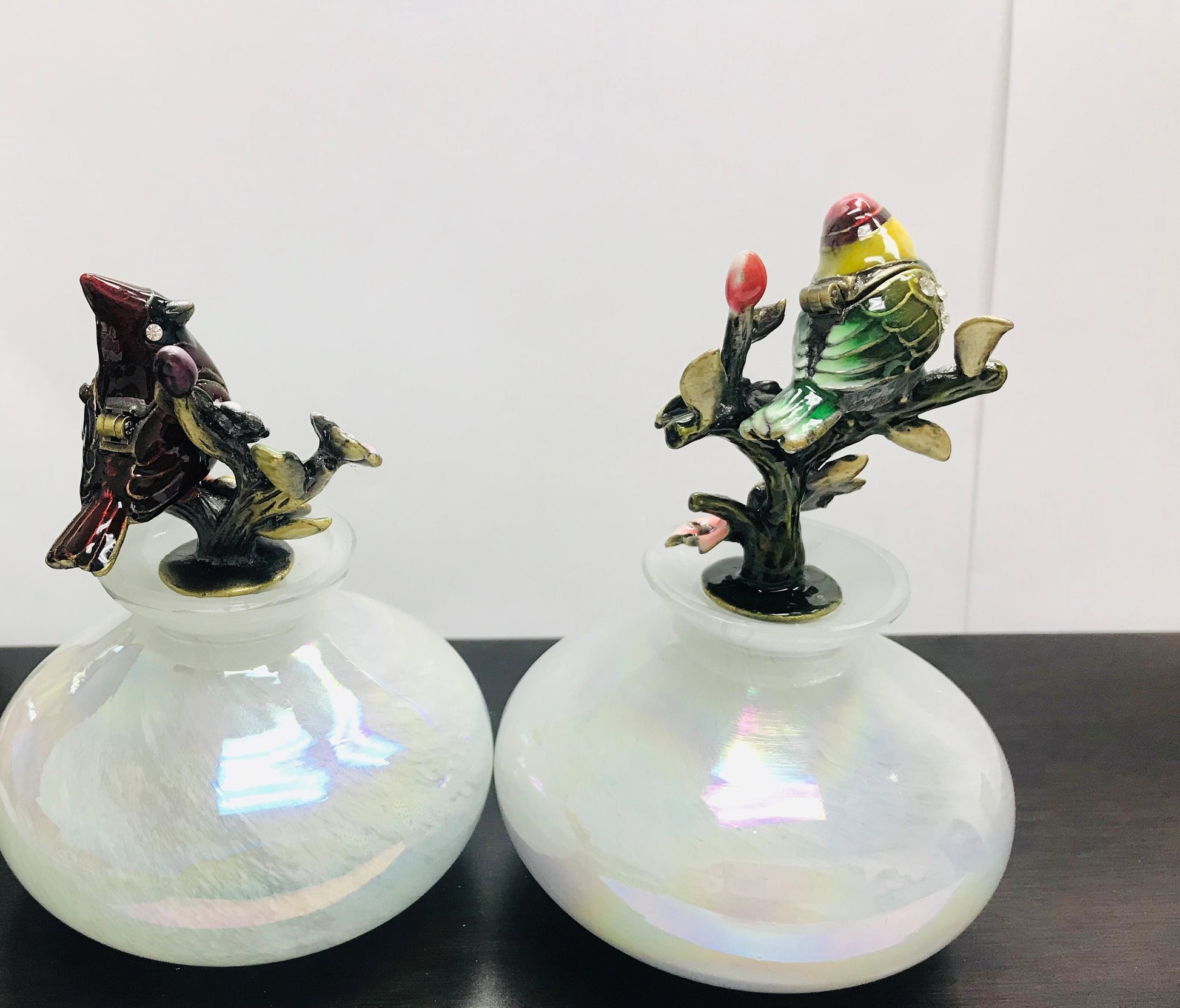 Stylish perfume bottle made with glass, The bottle cover are designed with birds and flower made out of pewter. It is hand painted and hand jeweled with crystals.