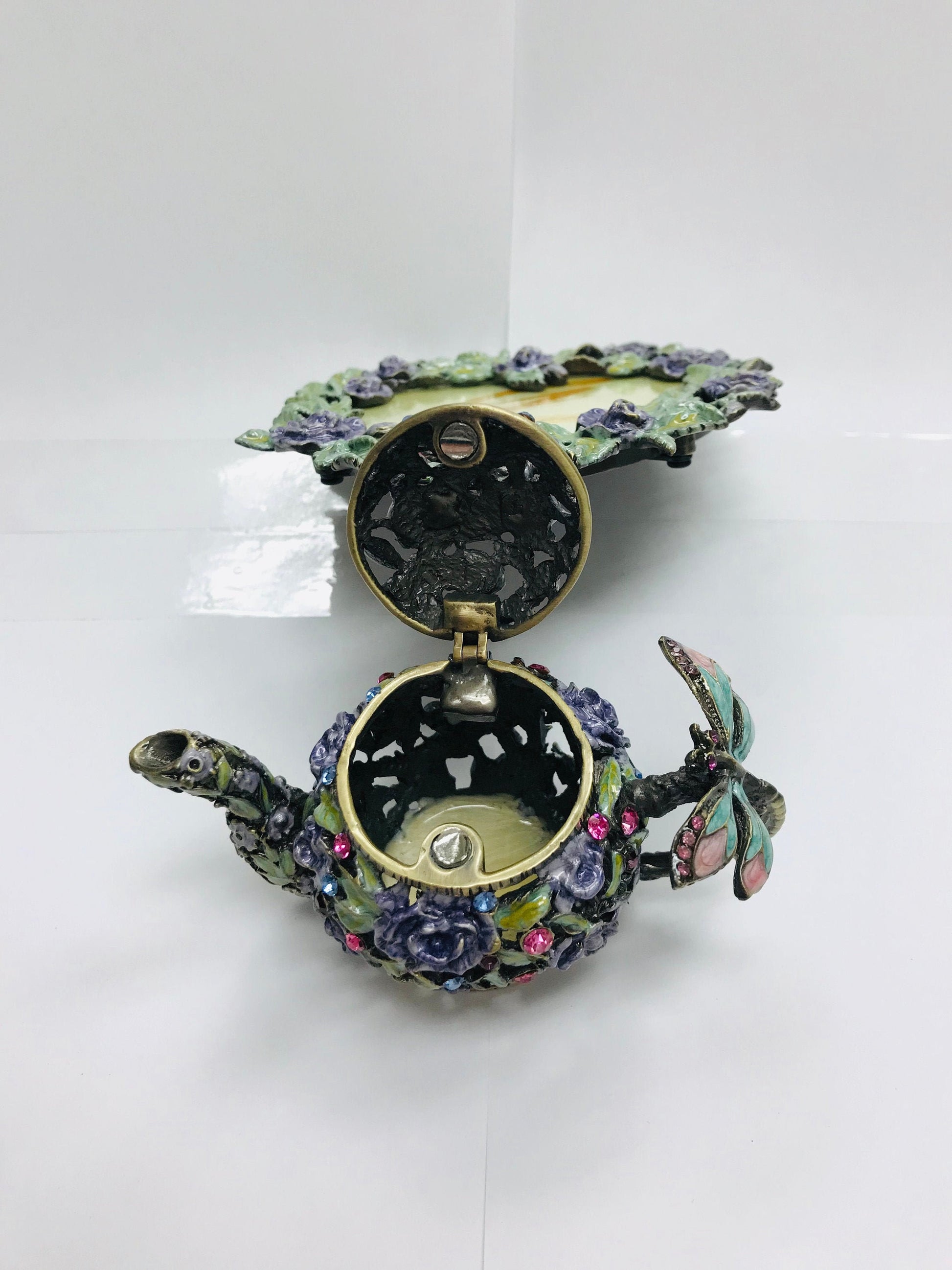 It is made with pewter. The design are hand painted and hand jewel with crystals. The trinket can used to store small items like earrings.