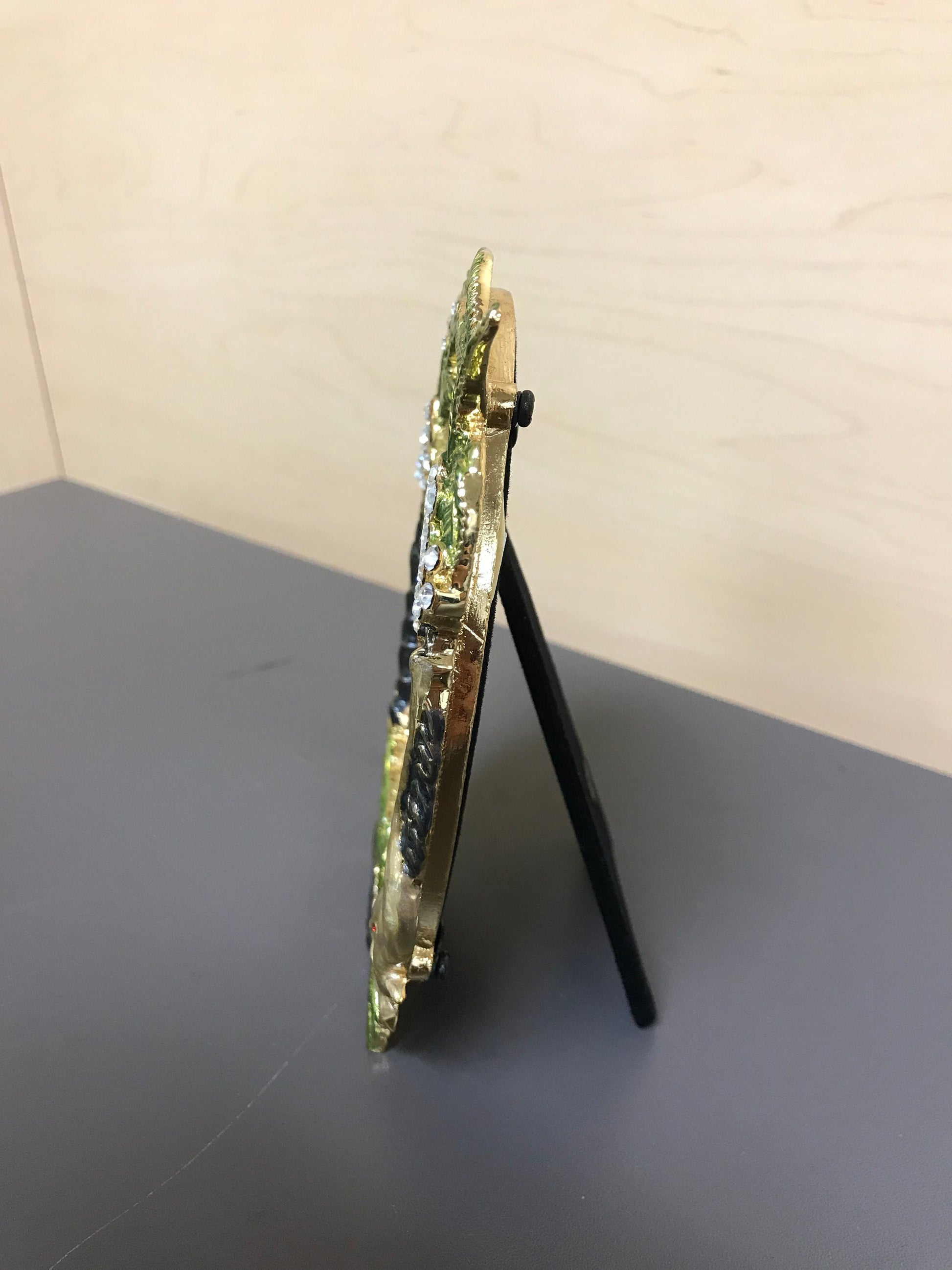 It is made with pewter, hand painted and hand jeweled with crystals.